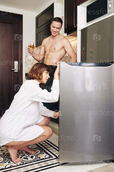 Женщина ищет что-то поесть в холодильнике