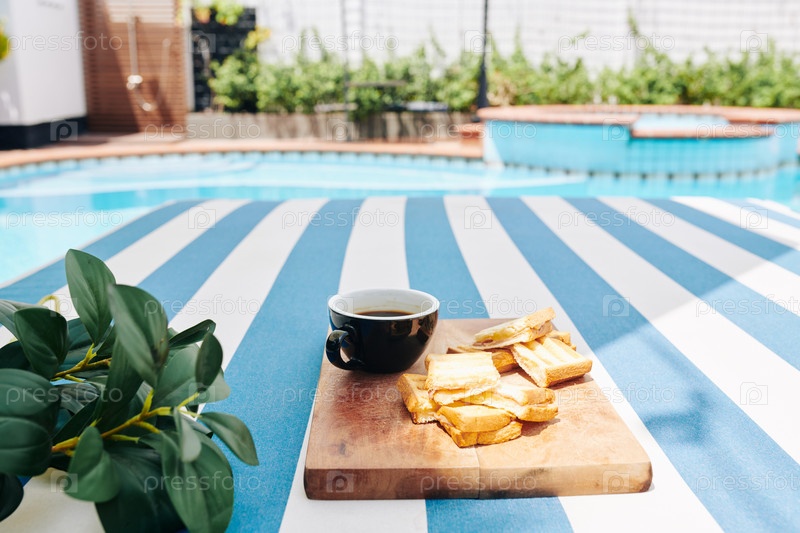 Кофе и тосты подают на деревянной доске