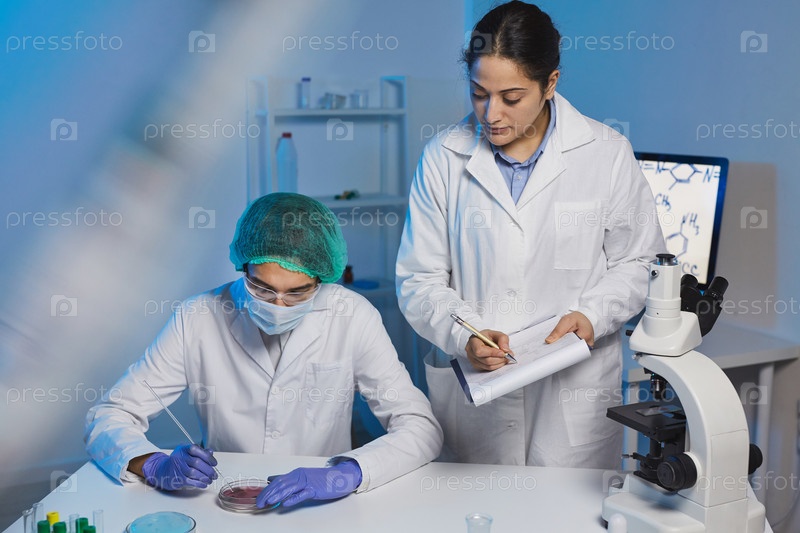 Команда молодых мультиэтнических клинических исследователей в лабораторных пальто, работающих с медицинскими веществами в современной лаборатории