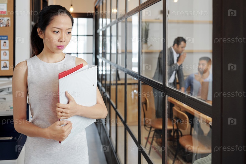 Секретарь с папками ходит по офису