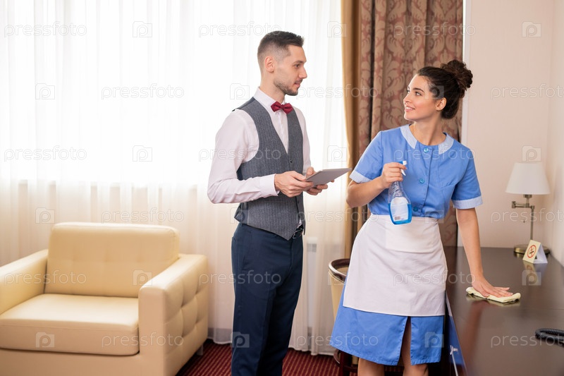 Красивая горничная убирает стол, глядя на Портера во время разговора