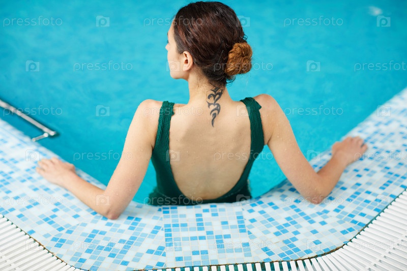 Задний вид молодой женщины с татуировкой на шее, опирающейся на накопившийся край бассейна во время отдыха в спа-салоне