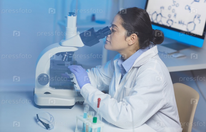 Концентрированная молодая индийская женщина-технолог в белом пальто, сидящая за столом и работающая с микроскопом в современной лаборатории