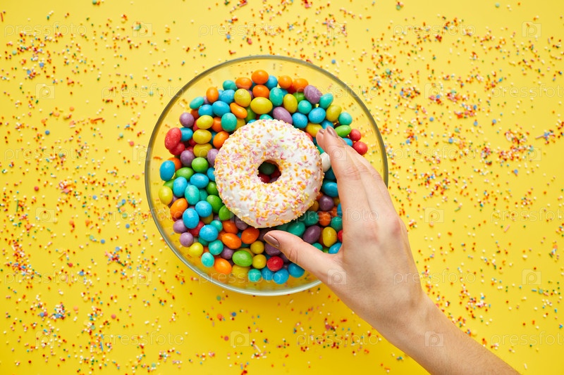 Вид сверху неузнаваемой женщины, протягивающей руку, чтобы взять сладкий пончик из миски с конфетами, желтый фон