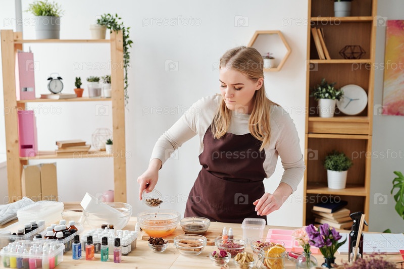 Молодая ремесленница добавляет измельченные сухие специи в миску с жидкой массой мыла
