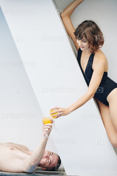 Молодая пара наслаждается коктейлями, отдыхая у бассейна