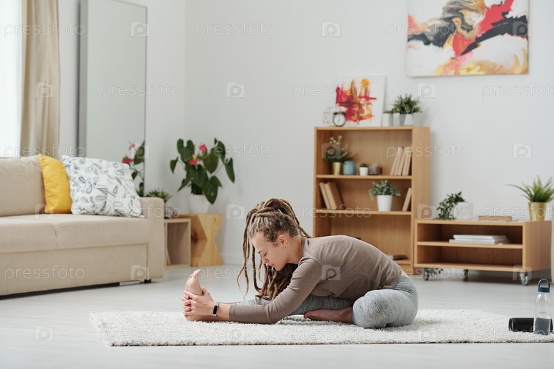 Активная девушка сидит на полу и растягивает ногу вперед во время упражнений