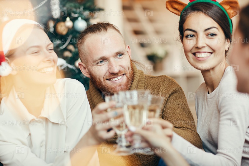 Веселые молодые люди выпивают за Рождественскую вечеринку