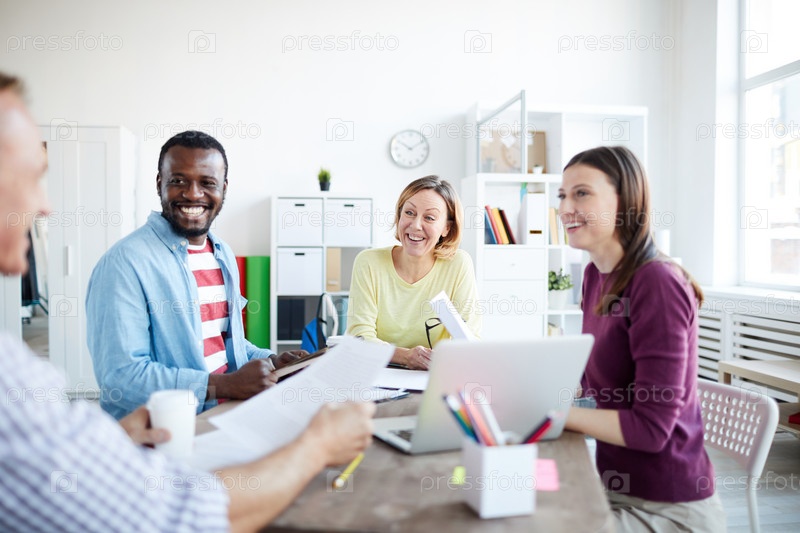 Группа возбужденных мультиэтнических коллег в повседневной одежде, сидящих за столом и смеющихся вместе во время обсуждения документов на встрече