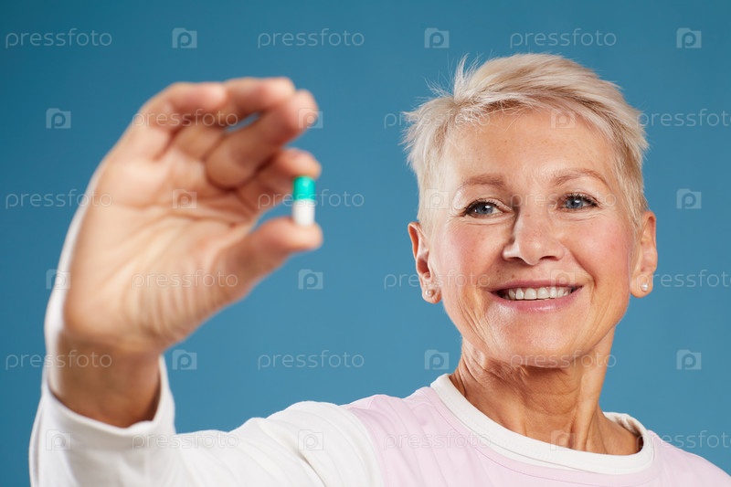 Близкий план удовлетворенной женщины-медицинского учёного, стоящей на синем фоне и держащей капсулу во время открытия нового препарата