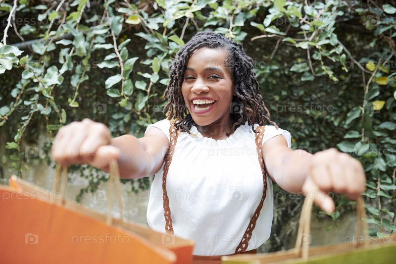 Взволнованная молодая женщина показывает бумажные пакеты