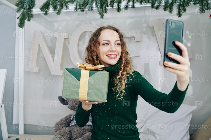 Очаровательная женщина фотографирует с подарком