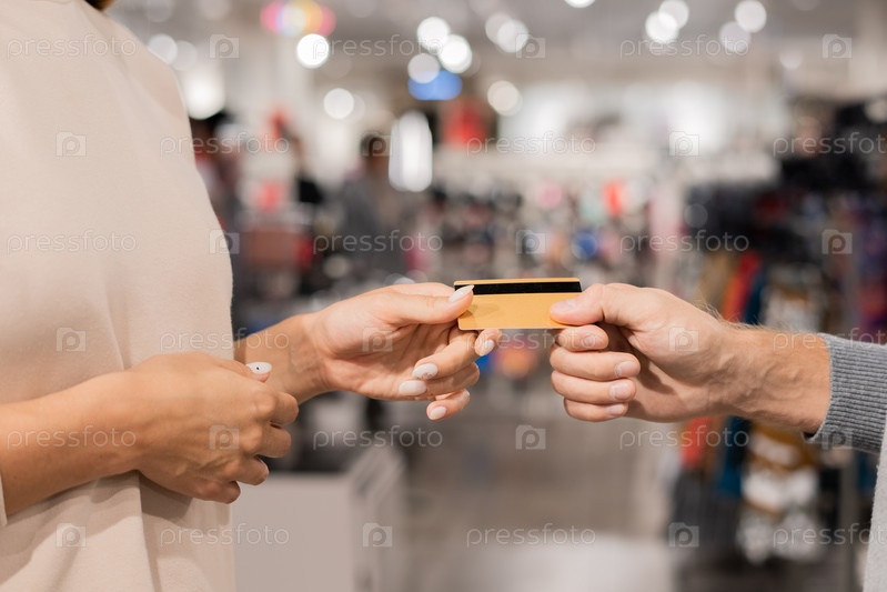 Рука молодой женщины, принимающей пластиковую карту у мужчины в торговом центре