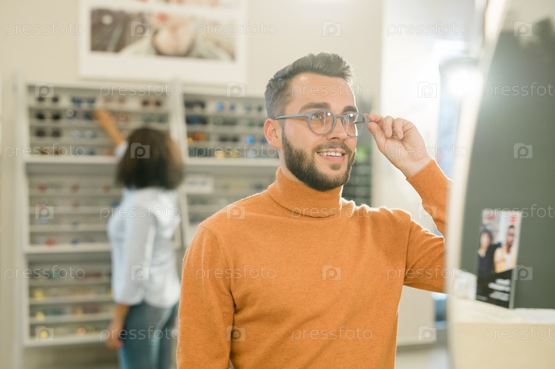 Молодой улыбающийся мужчина в пуловере пробует новые очки перед зеркалом