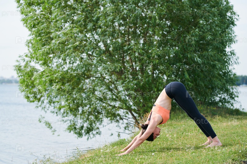 Выполнение выступления 'собака вниз' на берегу