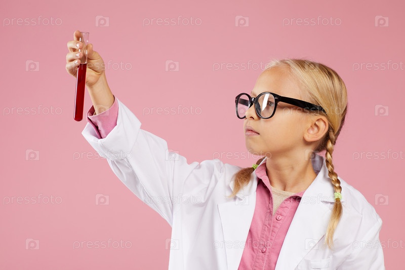Серьезный заботливый маленький доктор с блондинками, в очках и лабораторном пальто стоит на розовом фоне и анализирует образец крови в пробирке