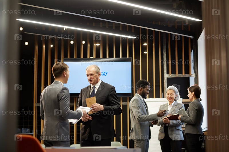 Старший бизнесмен в черном костюме обсуждает деловую презентацию с коллегой в конференц-зале