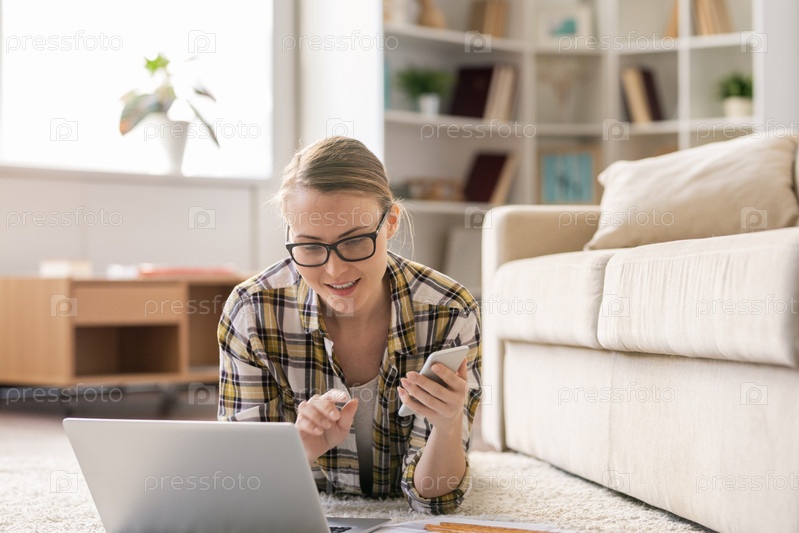 Позитивная фрилансерская женщина, использующая смартфон и ноутбук