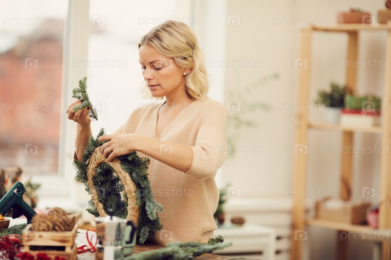 Серьезно занятая красивая молодая женщина в неформальном свитере, стоящая за столом на мастерской и прикрепляющая хвойные ветви к венку во время подготовки украшений для Рождества
