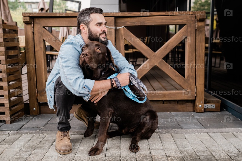 Счастливый молодой человек сидит на приседаниях и обнимает свою милую коричневую чистокровную собаку