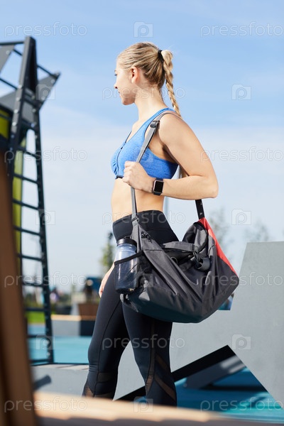 Современная атлетическая девушка в спортивной одежде стоит на площадке для тренировок на открытом воздухе и оглядывается вокруг, держа спортивную сумку