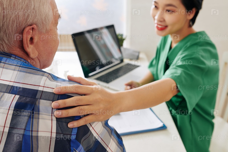 Улыбающаяся женщина-врач разговаривает с выздоравливающим пациентом