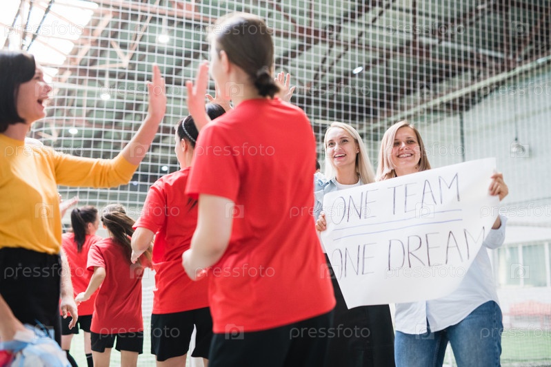 Одна из девушек-спортсменок, дающих высокую пятерку фанату или другу во время выхода на поле