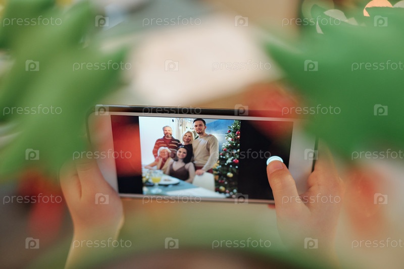 Руки ребенка, держащего смартфон во время фотографирования счастливой семьи за ужином