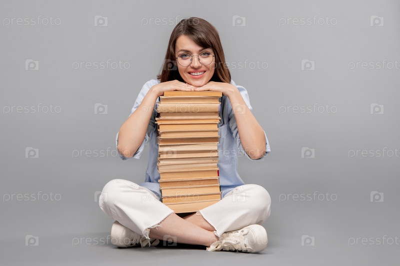 Молодая улыбающаяся студентка с подбородком над высокой кучей книг