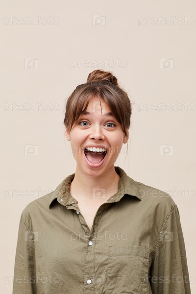 Портрет выразительной молодой женщины с брюнетками и булочкой для волос, кричащей громко от волнения