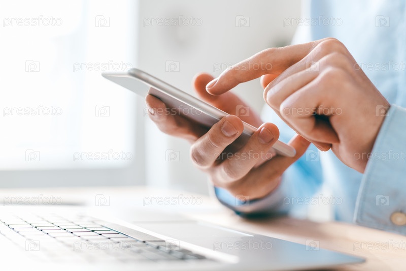 Руки молодого бизнесмена, указывающего на экран смартфона над клавиатурой ноутбука