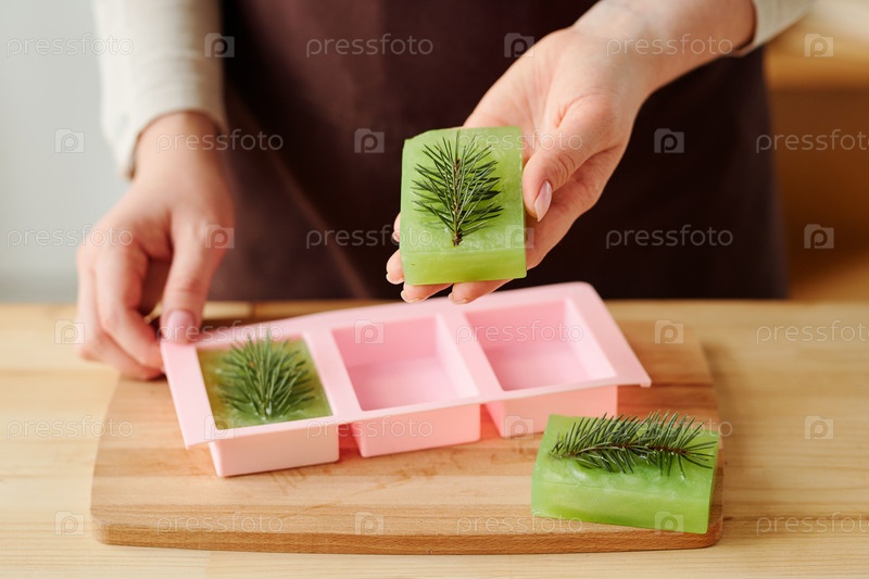 Руки девушки, держащей зеленый свежий ручной сапун с хвойными деревьями на вершине