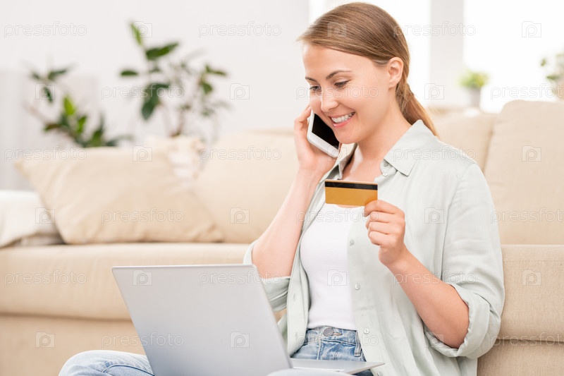 Веселая покупательница разговаривает с менеджером интернет-магазина, делая заказ