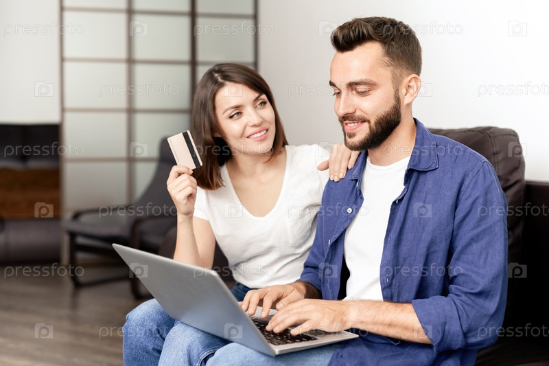 Пара покупает мебель в интернете