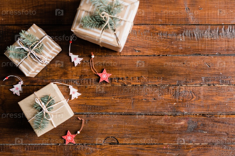 Деревянный фон стола с тремя упакованными и связанными коробками для подарков