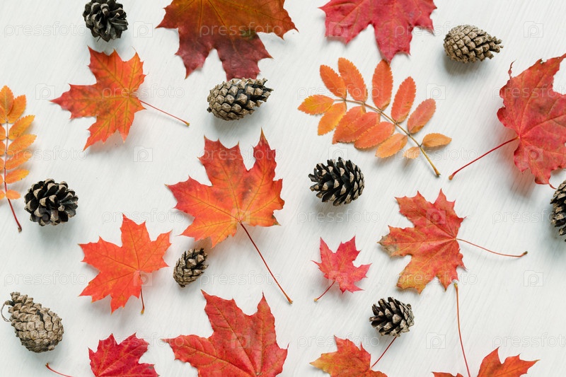 Осенний фон с красными кленовыми и рованскими листьями и конусами фиртри