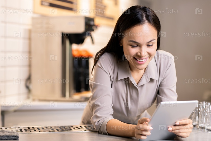 Счастливый молодой владелец роскошного ресторана использует цифровой планшет на рабочем месте