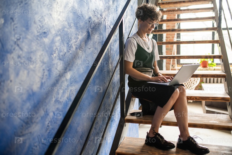Красивая мобильная студентка или сотрудник, сидящая на лестнице с ноутбуком на коленях