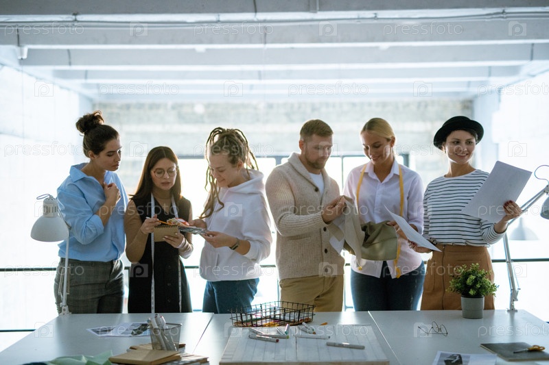 Группа молодых креативных дизайнеров выбирают цвета, текстильные и модные эскизы