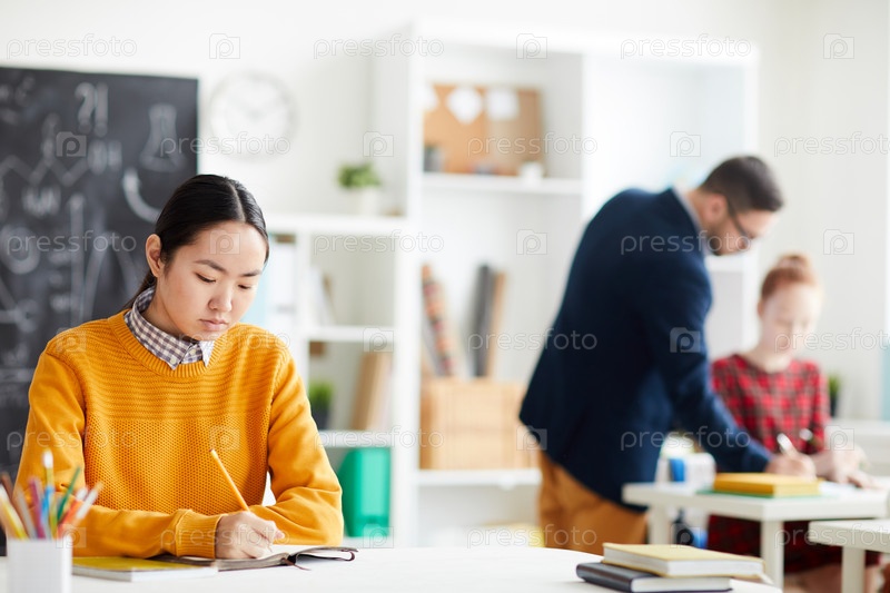 Серьезный сконцентрированный привлекательный молодой азиатский студент в рубашке и свитере сидит за столом и пишет в учебник, решая задания на уроке