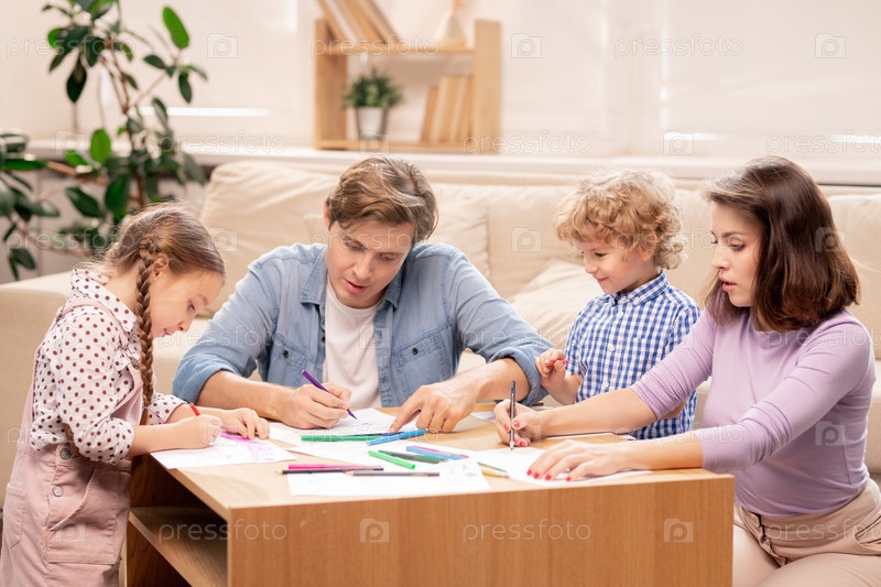 Молодая семья супружеской пары и их двое маленьких детей начального возраста рисуют