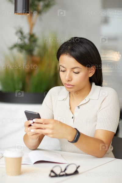 Женщина с мобильным телефоном в кафе