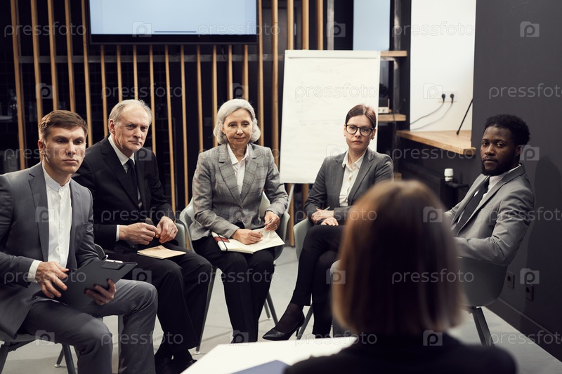 Группа серьезных мультиэтнических бизнесменов разного возраста, сидящих в полукруге против учителя и внимательно слушающих ее на курсе восстановления