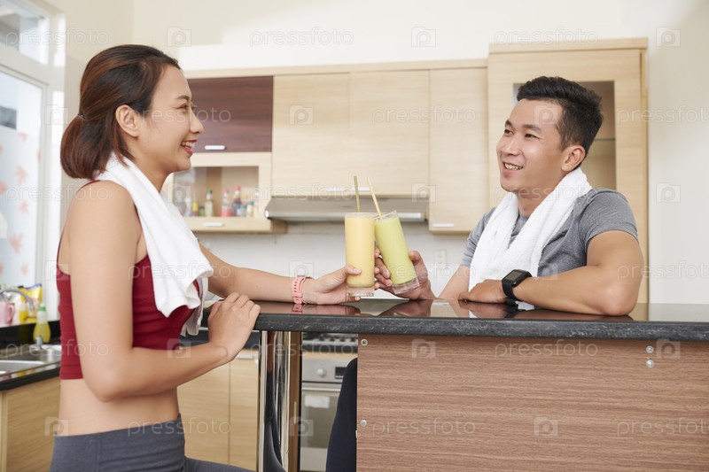 Спортсмен и спортсменка пьют протеиновые коктейли