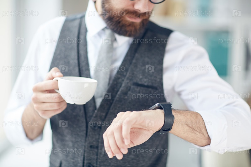 Близкий план стильного бизнесмена в сером жилете, пьющего кофе из чашки и смотрящего на наручные часы во время проверки времени перед перерывом