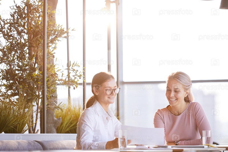 Веселые привлекательные молодые бизнес-женщины, сидящие за столом в современном кафе и просматривающие результаты опросов во время создания рекламного плана для нового продукта