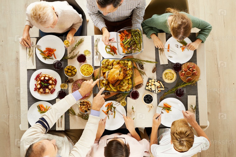 Семья ест мясо с овощами