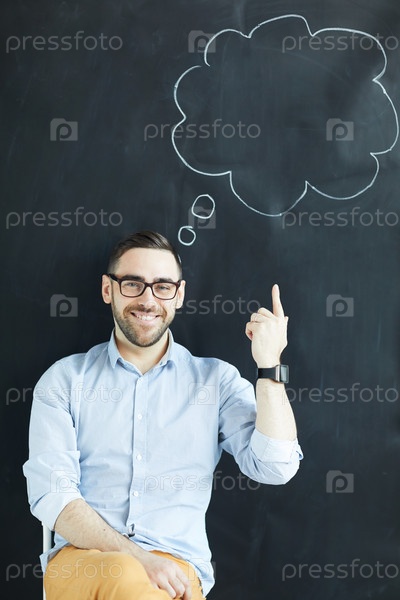 Веселый красивый молодой креативный мужчина со стержнем, сидящий на стуле против доски с нарисованным облаком пузырьков речи и указывающий на свою идею