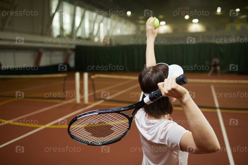 Задний вид сильной брюнетной женщины в шляпе, стоящей на теннисном корте и качающейся рукой с ракетой для удара по мячу