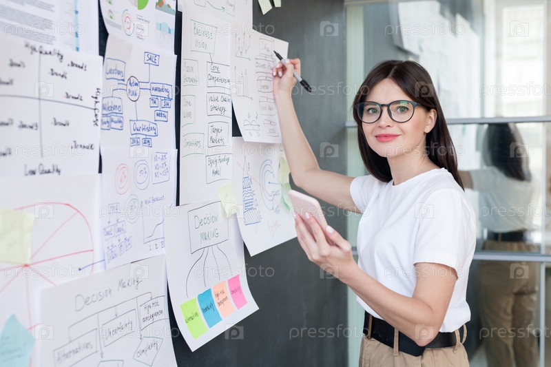 Красивый юный улыбающийся бизнес-тренер со смартфоном готовится к семинару